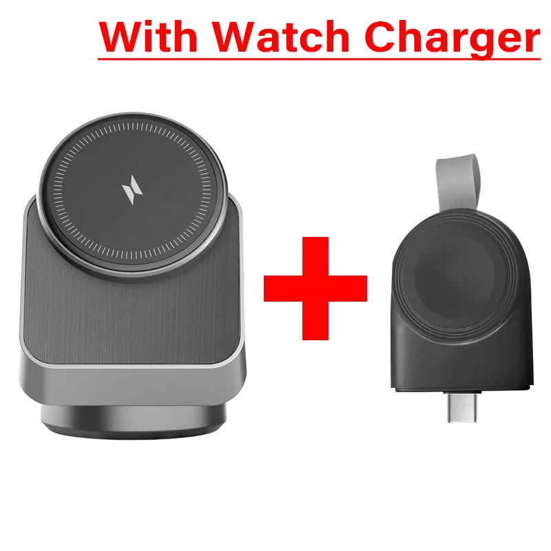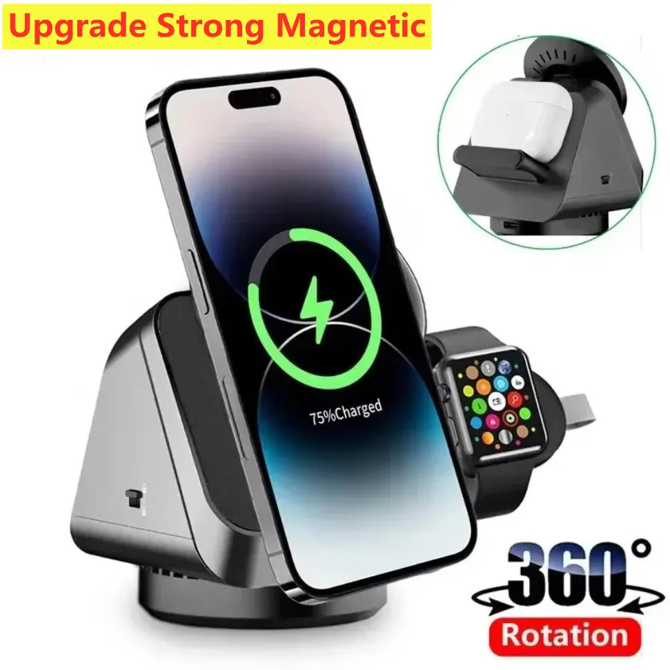 Rechargez tous vos appareils Apple en un seul geste avec cette station 3-en-1 magnétique, compacte et rotative. Parfaite pour la maison, le bureau ou les déplacements, elle permet de recharger simultanément votre iPhone (MagSafe), votre Apple Watch et vos AirPods, tout en gardant votre espace bien organisé.